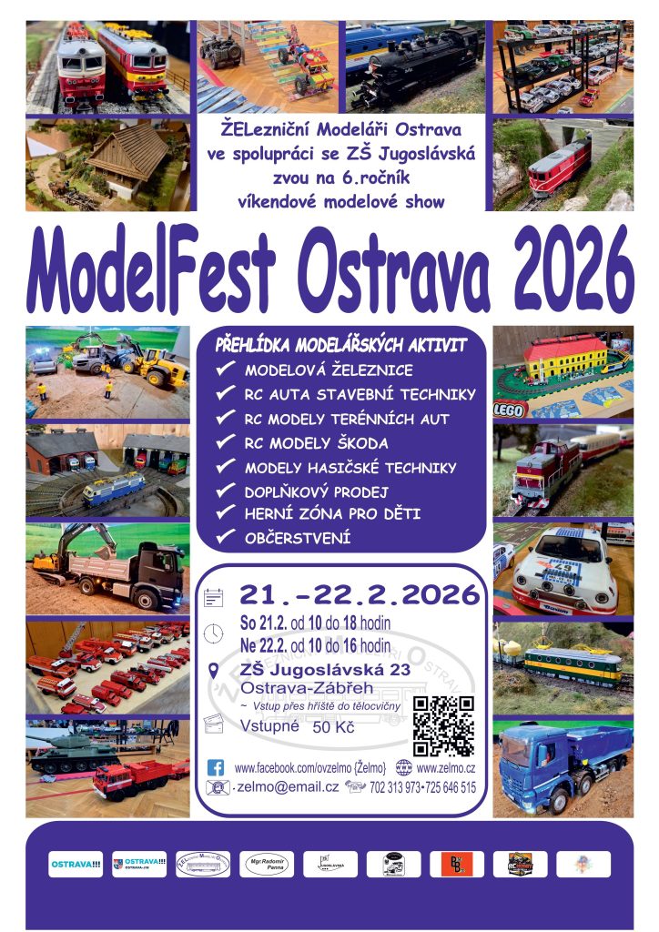Výstava ModelFest Ostrava 2026 proběhne v sobotu 21. února 2026 (od 10 do 18 hod.) a v neděli 22. února 2026 (od 10 do 16 hod.) v prostorách ZŠ Jugoslávská v Ostravě – Zábřehu (vstup přes hřiště do tělocvičny). Další informace budeme postupně zveřejňovat zde na našem facebookovém profilu!Budeme rádi za sdílení této divácky atraktivní akce, protože bude určitě na co koukat !!!